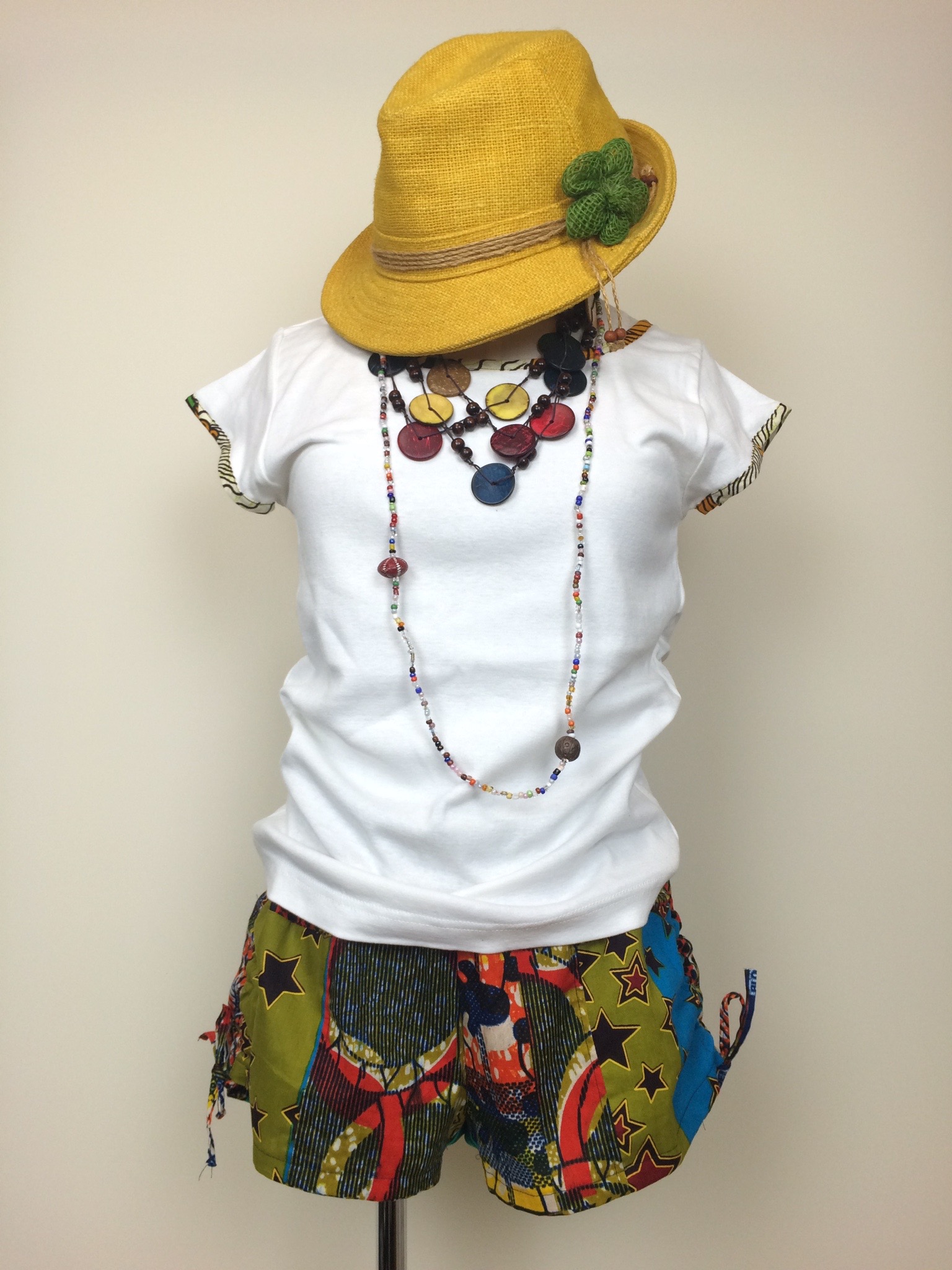 実はこのTシャツ、襟と袖の部分にアフリカ布がパイピングしてあるので近くで見ると超キュート。