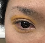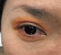 ④クリースのくぼみにそって、黄色、その上にオレンジを乗せる。目の下にも。
