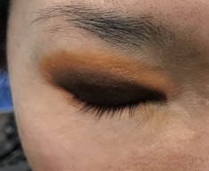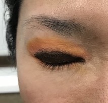 くぼみにきいろとオレンジをつける場合はクレオンで黒塗りした後は、何もついてないブラシで堺目をぼかす。目のキワは黒のシャドウで上の方にぼかし、何もついてないブラシでオレンジのシャドウとブレンドする。まぶたの真ん中にはラメをのせてゴージャスにする。