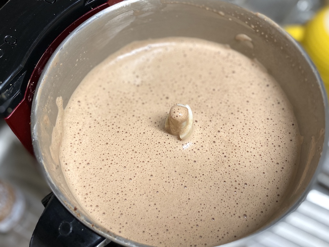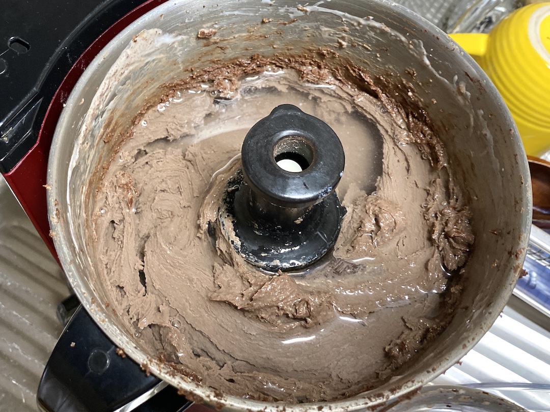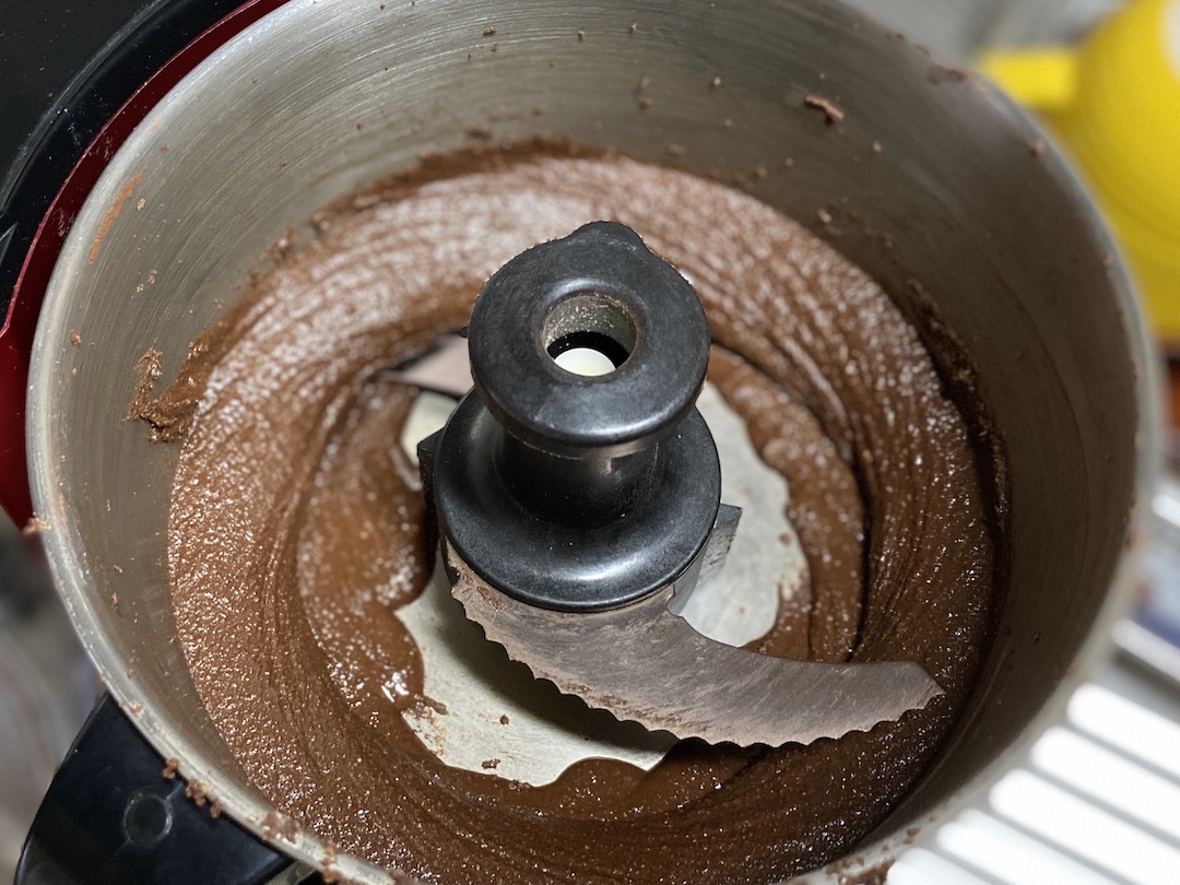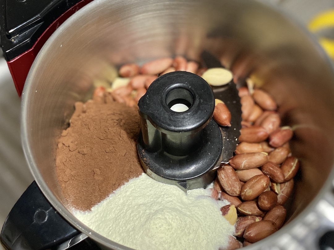1、ピーナッツとココアとミルクをフードプロセッサーに入れ、ペースト状になるまで回す。(ピーナッツに油分が含まれているので水分を足さなくてもペースト状になります。)