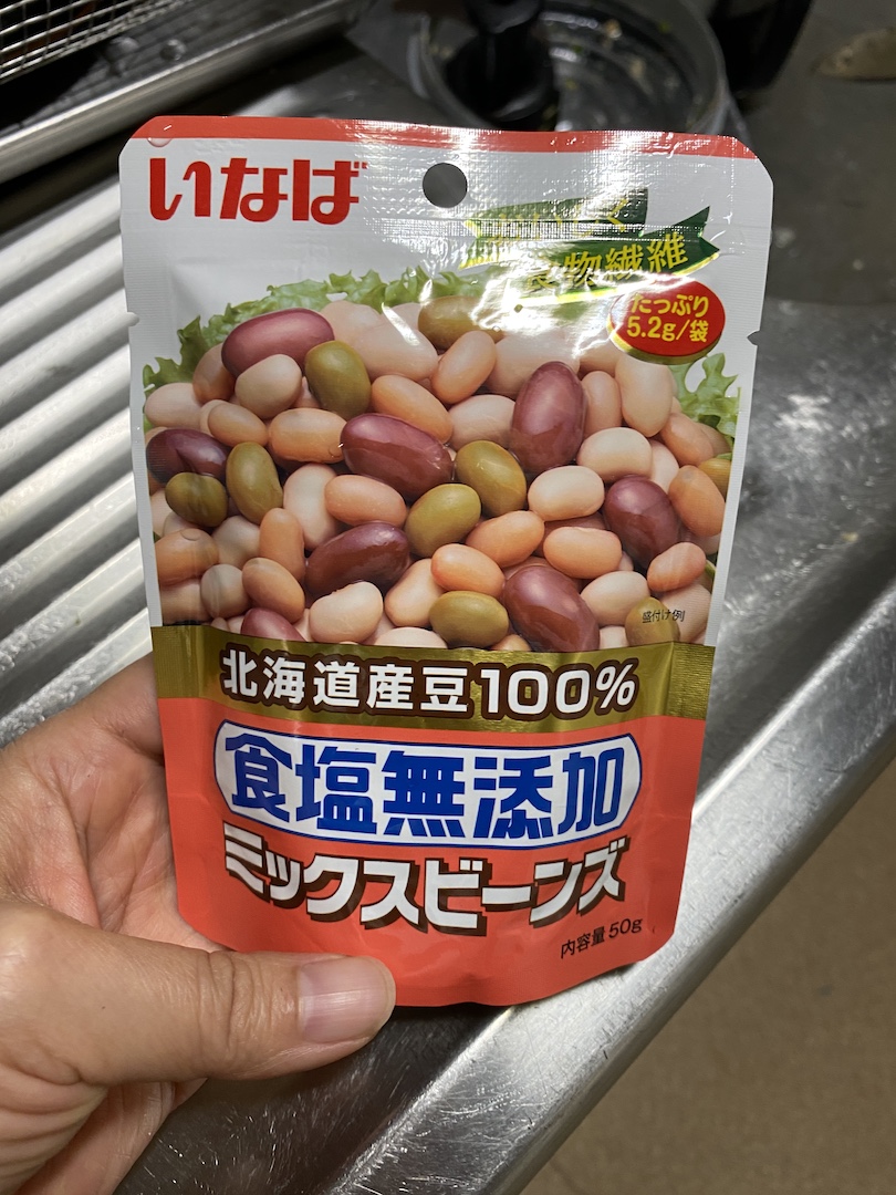 7、ミックスビーンズを入れ鷹の爪を入れる。