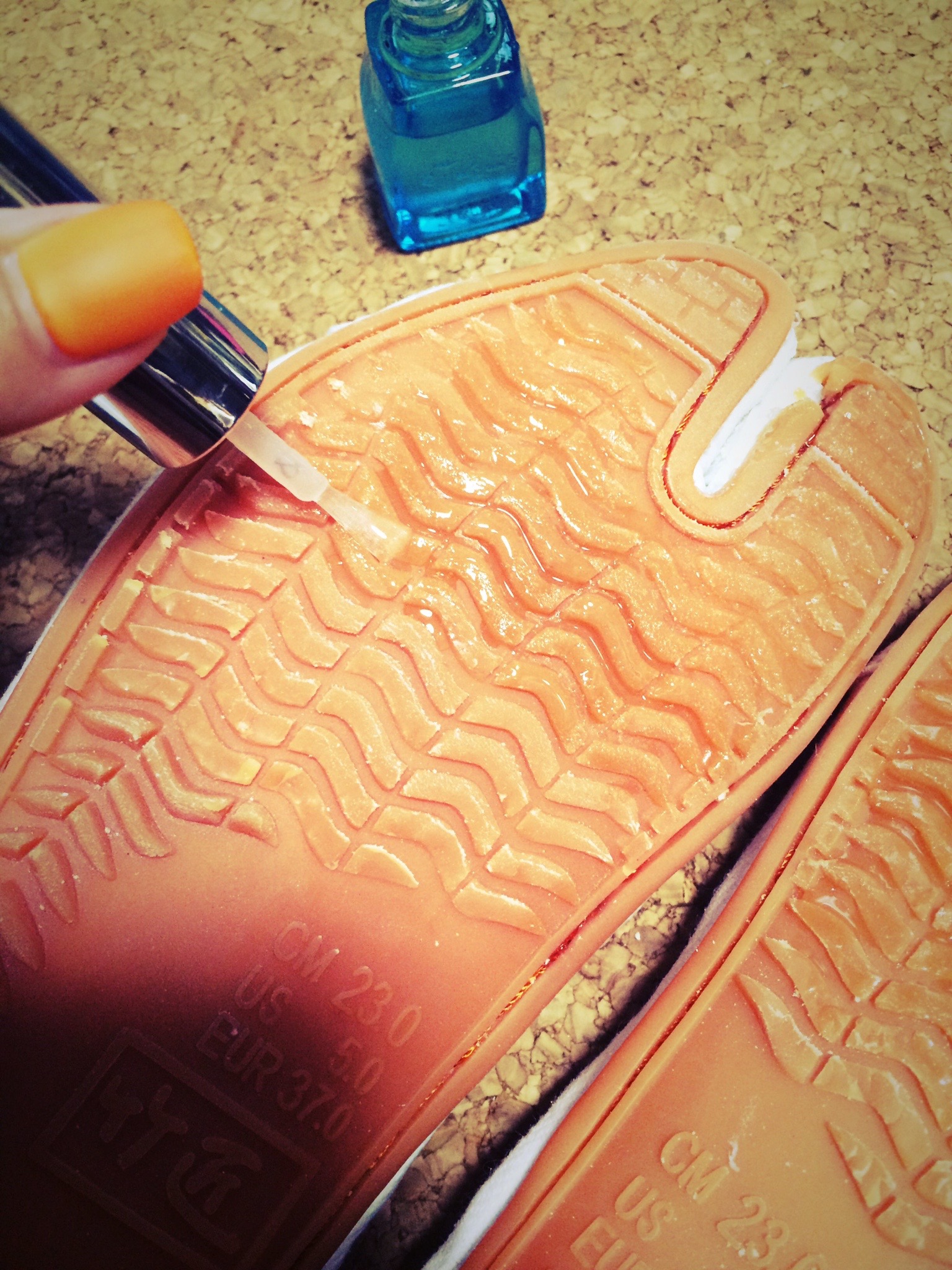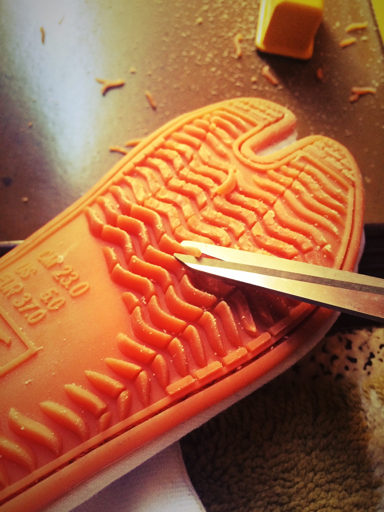 地下足袋のゴムのヒダを切り落とし、ヤスリにかけ、マニキュアのトップコートで滑りやすくコーティングするという手段に出た。
