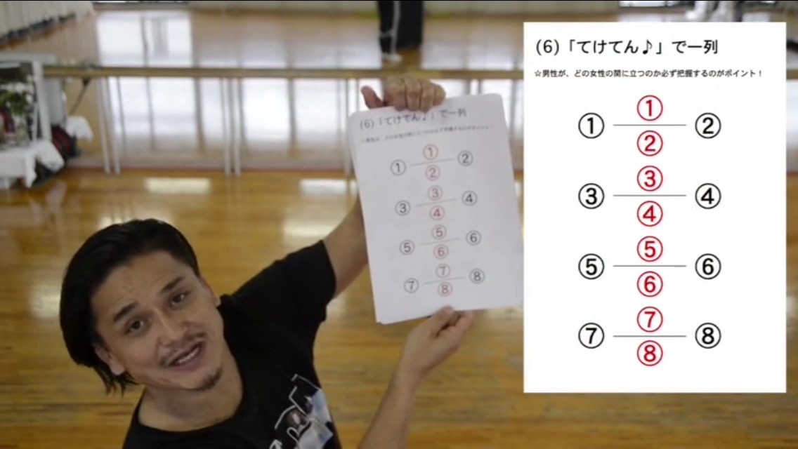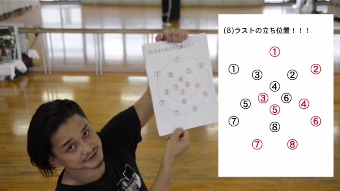 立ち位置は、女子の1〜8、男子の1〜8とあり、そのポジションで移動する場所や、振りが入るカウントが変わる。