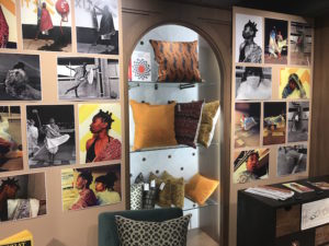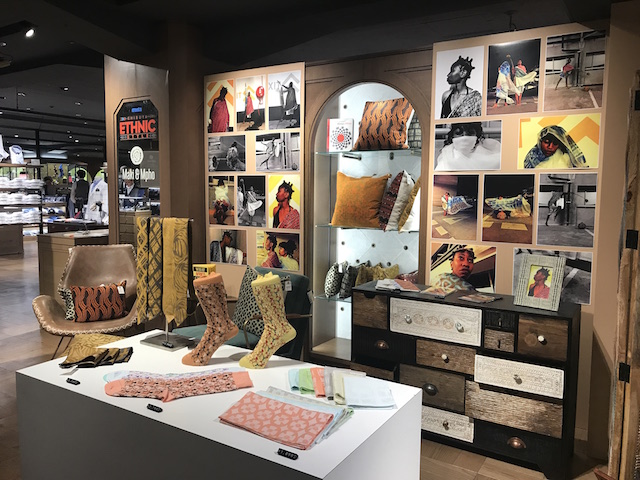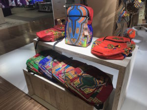 南アフリカのデザイナーとのコラボで布のプリント柄からデザインされているファブリックを使っての雑貨が素敵だった。