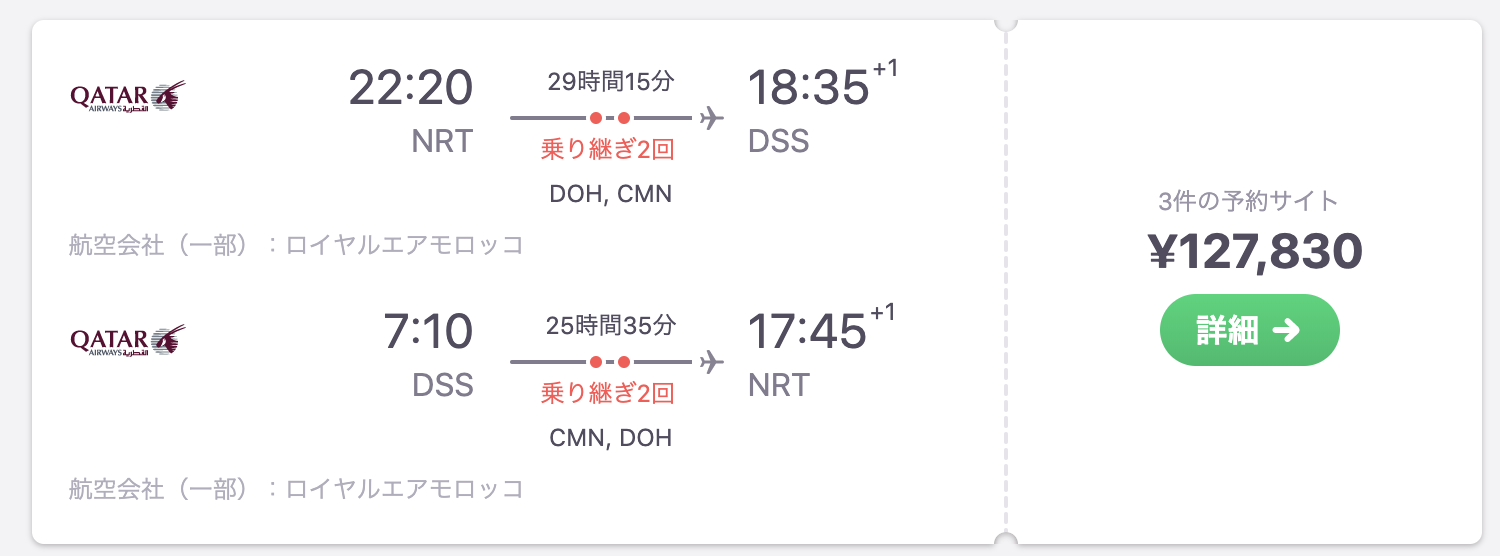 検索する場合は、成田(日本)発、⇆ ブレーズ・ジャーニュ(セネガル)発でお調べください。