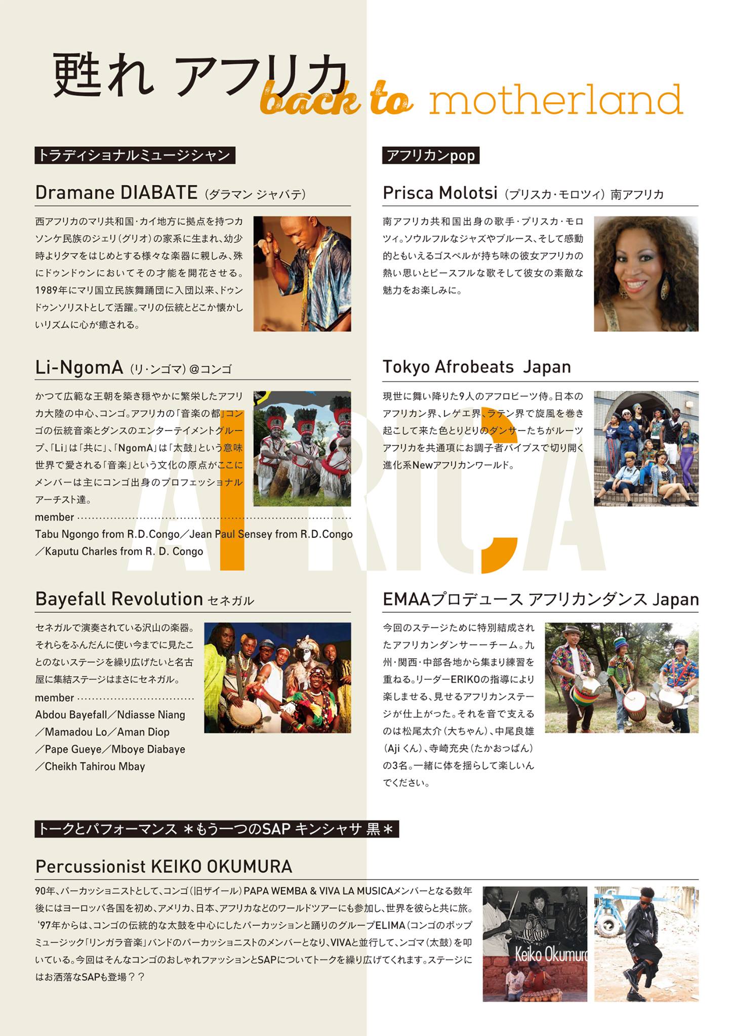 出演:Dramane Diabate(マリ)、Li-Ngoma(コンゴ)、Bayfall Revolution(セネガル)、Prisca Molotsi(南アフリカ)、Tokyo Afrobeats Japan(東京)、アフリカンダンスJAPAN(九州・関西・名古屋)with大ちゃん・Aji・たかおっぱん、KEIKO OKUMURA(トークとパフォーマンス)